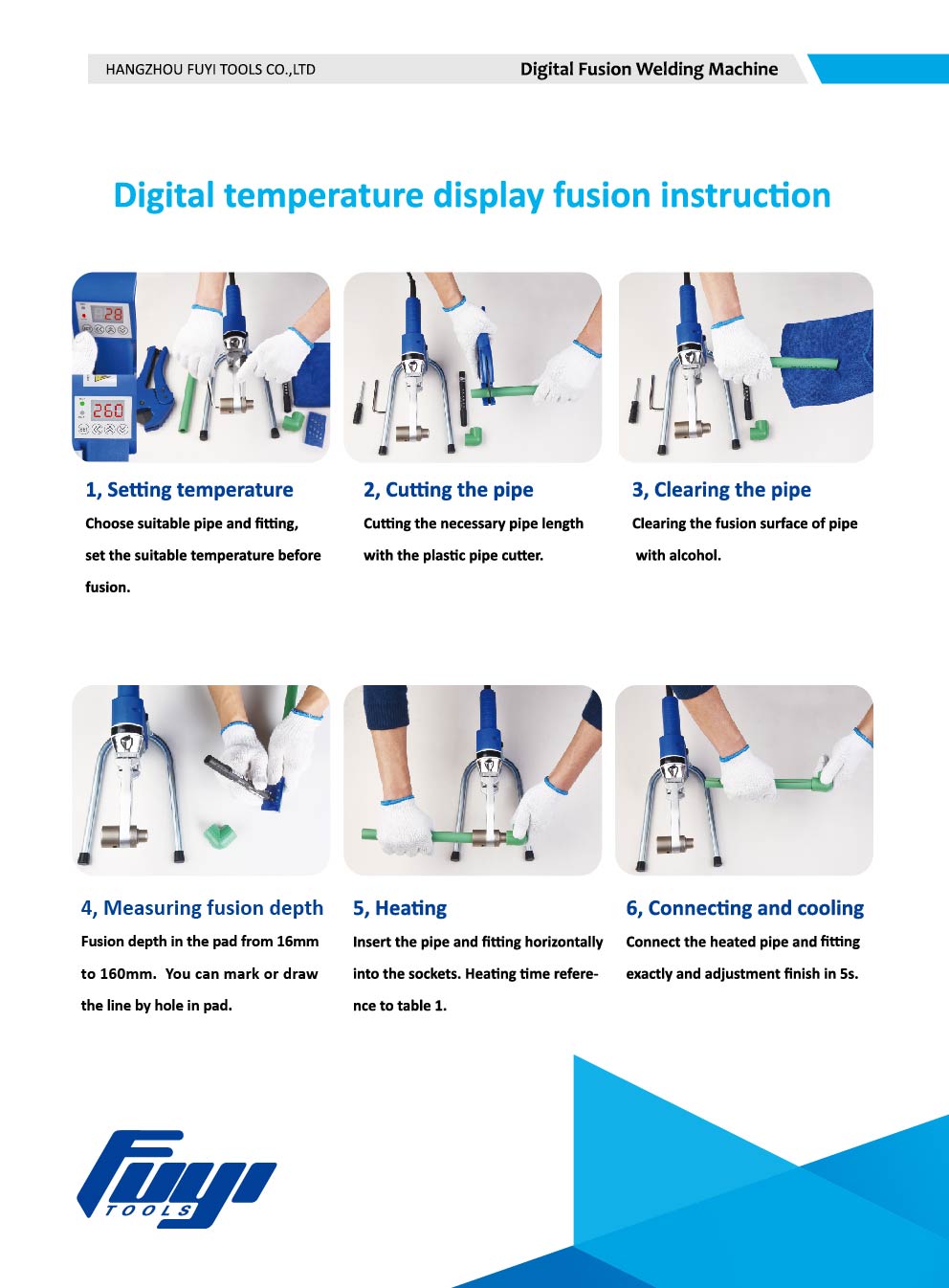 Jak korzystać z cyfrowej zgrzewarki gniazdowej 1. Ustawianie temperatury Wybierz odpowiednie rury i złączki, ustaw odpowiednią temperaturę 2. Cięcie rury Przycięcie odpowiedniej długości rury za pomocą obcinaka do rur z tworzywa sztucznego. 3. Czyszczenie rury. Oczyszczenie powierzchni zgrzewanej rury alkoholem 4. Pomiar głębokości wtapiania Głębokość wtapiania w podkładce od 16mm do 160mm. Możesz zaznaczyć lub narysować linię po otworze w podkładce. 5. Ogrzewanie Włóż rurę i kształtkę poziomo do kielichów. Czas nagrzewania podano w instrukcji dołączonej do zestawu. 6. Podłączanie i chłodzenie Podłącz dokładnie ogrzewaną rurę i złączkę i wyreguluj wykończenie w ciągu 5s.